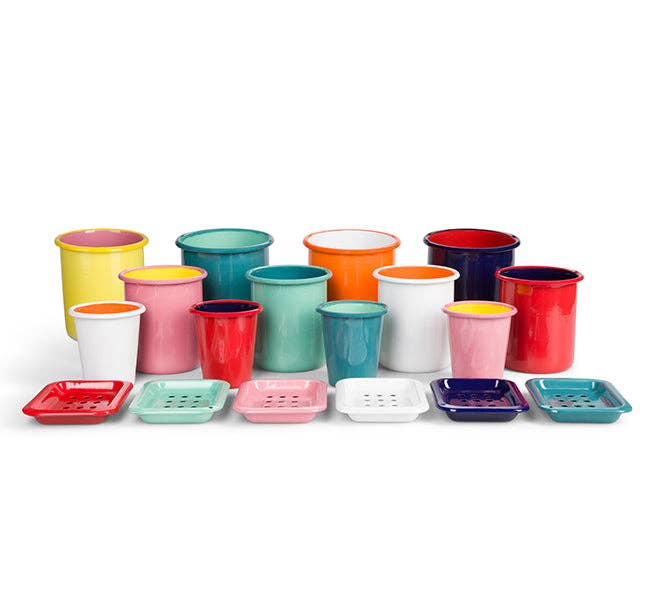 A classic enamel Utensil Holder, crafted here in a combination of Sulphur Yellow & Old Rose, two key colours that work beautifully together from our archival BRITISH COLOUR STANDARD Dictionary. An ideal piece for the kitchen or bathroom, its ideal size and weight make it perfect for loading up with spoons, spatulas, brushes etc. it won't topple over! The item is gift-boxed in a neat, recyclable kraft card box. Traditionally made Enamelware is incredibly durable, with the colourful ceramic -style 'glazed' coating fired onto the metal piece. The utensil holder measures 14cm D x 15 cm H (5.5" D x 6" H) and weighs 465g. To care for it, try to avoid chipping, do not use abrasive pads/cleaners, and do not place in a microwave or freezer. It's domestic dishwasher safe.